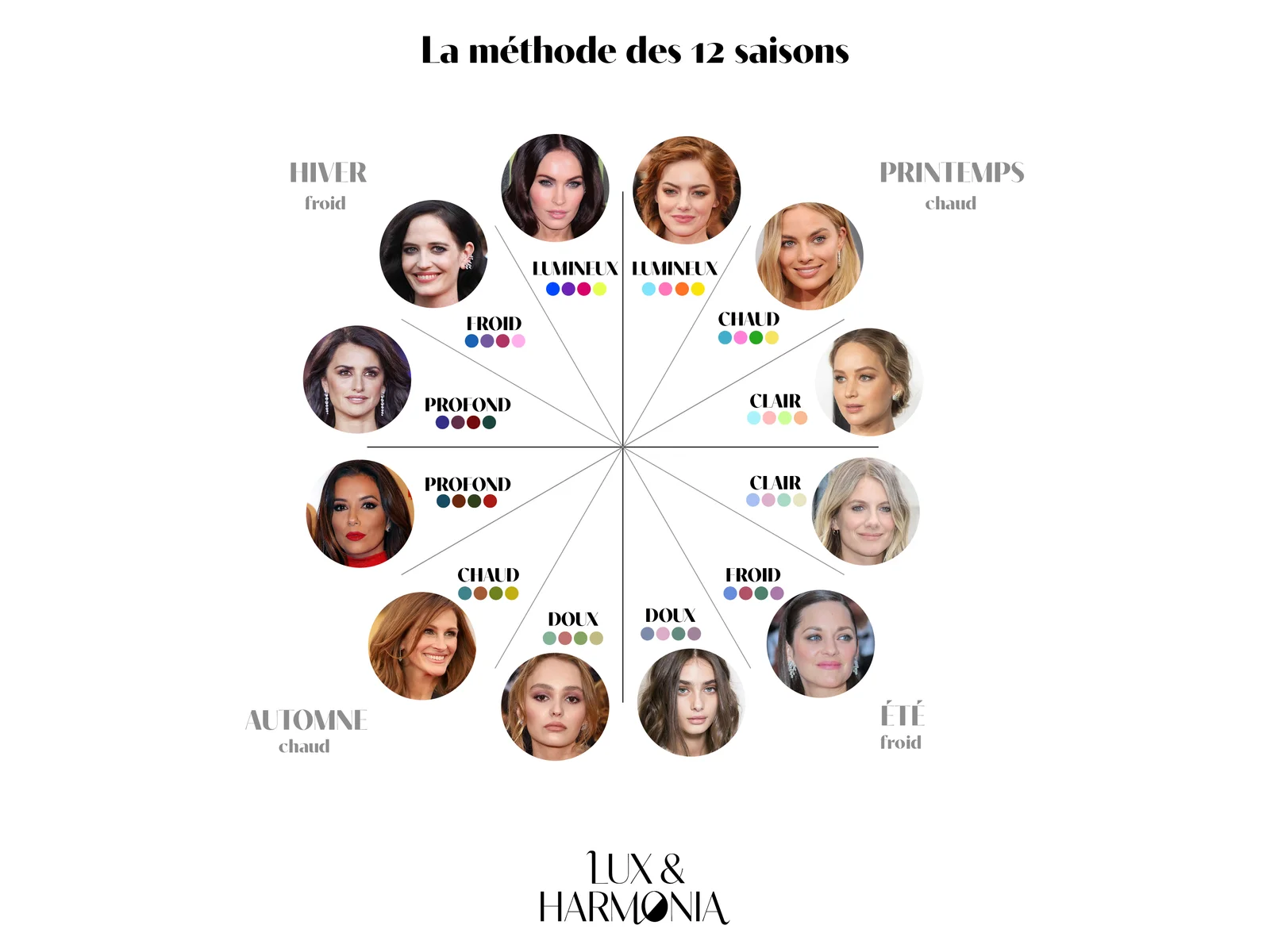 La combinaison de ces caractéristiques permet d’obtenir votre profil colorimétrique parmi les 12 saisons